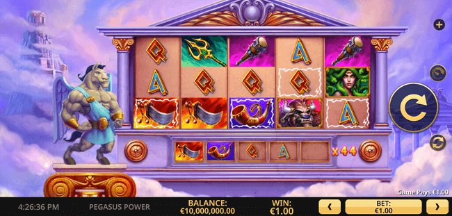 Pegasus Power เพกาซัสเป็นม้ามีปีกในตำนานเทพเจ้ากรีก เป็นลูกของโพไซดอนและเมดูซ่า ที่นี่เขายืนอยู่ที่ด้านข้างของวงล้อซึ่งมีกรอบอยู่ที่มุขของวิหารกรีก ในเบื้องหลังเราสามารถมองเห็นอาคารอื่นๆ บนยอดเขาเหนือเมฆได้ สัญลักษณ์ในเกม สล็อต นี้ได้รับการออกแบบมาอย่างดี และเพลงประกอบเป็นธีมออเคสตราที่ถูกขัดจังหวะด้วยเสียงประโคมเมื่อบทเพลงที่ชนะปรากฏขึ้น