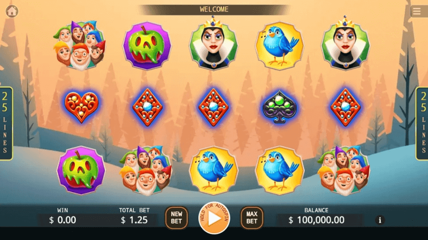 สโนว์ไวท์ตั้งอยู่บนตารางขนาด 5×3 วงล้อพร้อมช่องจ่ายเงิน 25 ช่องและโอกาสในการชนะมากมาย มงกุฎที่เป็นที่ต้องการจะทำหน้าที่เป็นตัวเสริมในช่องนี้ โดยมีความสามารถในการแทนที่สัญลักษณ์ใดๆ ยกเว้น Scatter เพื่อช่วยให้คุณได้รับรางวัลที่ใหญ่กว่าและดีกว่า