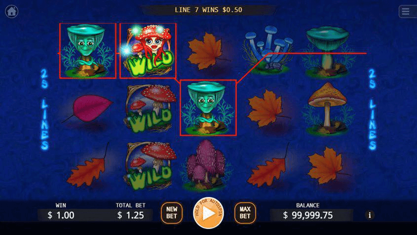 รูปแบบการเล่นแบบคลาสสิกมีสัญลักษณ์การจ่าย 13 สัญลักษณ์ รวมถึงWildและScatters และมีโบนัสหมุนฟรีพร้อมWildและวงล้อWildที่สามารถรับประกันชัยชนะครั้งใหญ่ได้ KA Gaming ยังคงความคลาสสิกไว้ที่นี่ แต่มีศักยภาพที่ดีด้วยสัญลักษณ์ทั้ง 13 อันที่ได้รับรางวัล ทริปปี้เห็ดWildจะแทนที่สัญลักษณ์อื่นๆ ทั้งหมดยกเว้นScatters และสามารถขึ้นสามแต้มบนวงล้อเพื่อสร้างชัยชนะหลายวงล้อ