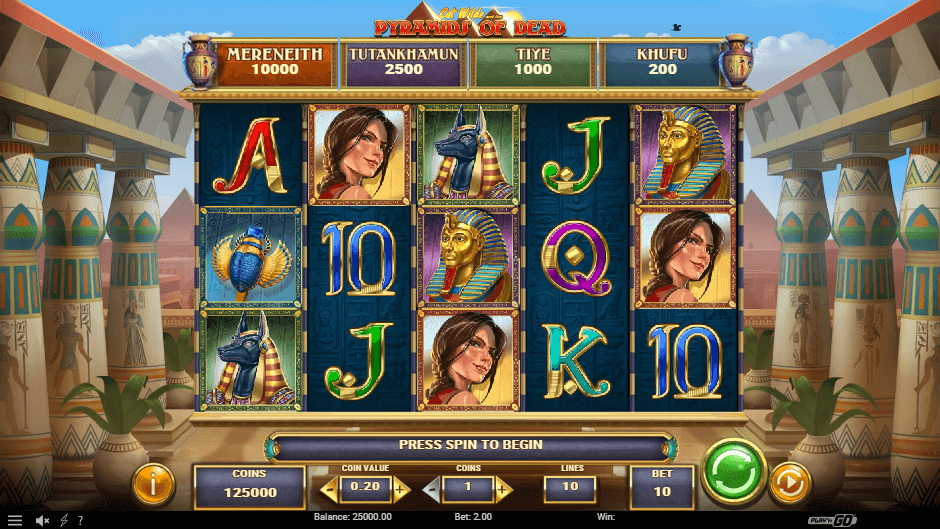 ปิรามิดและscattersแสดงทั้งแบบwildsและscatters นี่คือสัญลักษณ์การจ่ายเงินสูงสุดเช่นเดียวกับแคท wildsเอง ชั้นกลางประกอบด้วยฟาโรห์ สุสาน และแมลงปีกแข็ง ในขณะที่สัญลักษณ์การจ่ายเงินที่ต่ำกว่าของสล็อตแมชชีน Cat Wilde และ Pyramid of Dead ได้แก่ A, K, Q, J และ 10