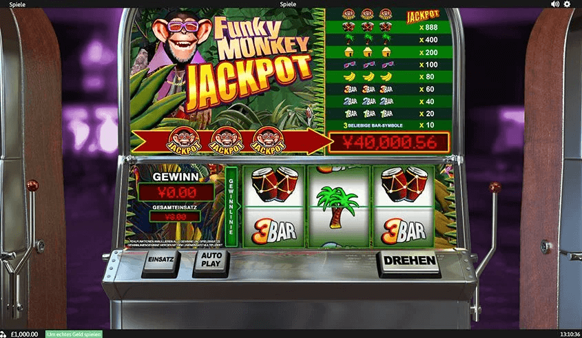 Funky Monkey Jackpot ชื่อนี้มีการออกแบบที่เป็นนวัตกรรมใหม่ที่เล่นเกมบนสล็อตแมชชีนกลไกสมัยเก่า พร้อมด้วย play arm ซึ่งสามารถคลิกเพื่อเปิดใช้งานการหมุนและปุ่มหมุนได้
