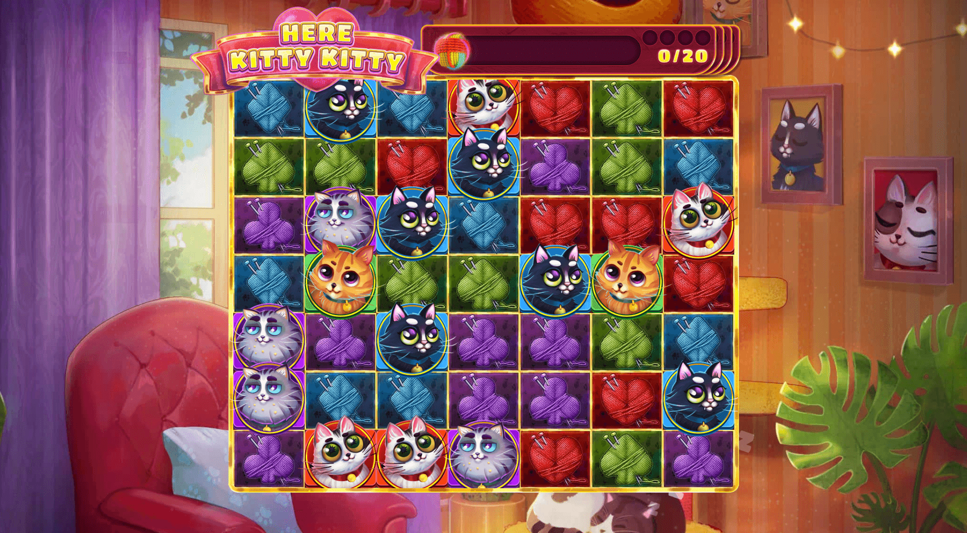 Here Kitty Kitty เริ่มต้นจากการชนะคลัสเตอร์มาตรฐานที่เล่นบน สล็อต 66 ที่มีขนาดตาราง 7 × 7 กลุ่มที่ชนะจะหายไปจากหน้าจอ ทำให้สัญลักษณ์คิตตี้จากด้านบนหล่นลงมาแทนที่ เป็นไปได้ที่จะตีกลุ่มสัญลักษณ์ที่จ่ายเงินสูงสุด 45+ สัญลักษณ์หากแมวตกมาถูกทาง ขณะที่เพื่อนขนปุยของคุณเดินเตร่ไปทั่วทั้งห้อง การแข่งขันแบบจ่ายเงินจะย้ายลูกบอลหลากสีสันไปบนแถบความคืบหน้า เมื่อผ่านด่าน ลูกบอลเส้นด้ายจะท่วมวงล้อเพื่อโต้ตอบกับสัญลักษณ์สุ่มในลักษณะการเลี้ยงขน ลูกบอลไหมพรมที่หลงทางอาจสลับสัญลักษณ์ ทำลายสัญลักษณ์ หรือเปลี่ยนให้เป็น Wild แบบสุ่ม เมื่อแถบความคืบหน้าเต็ม มันจะปล่อย Catmageddon และแมวสุ่มจะกลายเป็นสัญลักษณ์พิเศษพร้อมตัวคูณการชนะเพื่ออุ้งเท้าให้เต็มตารางเกมทั้งหมด