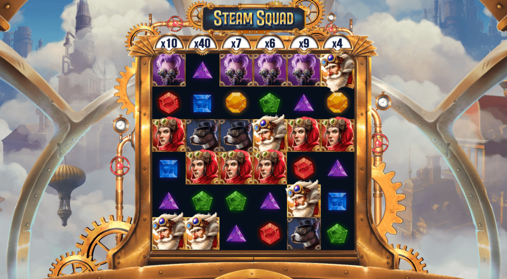Steam Squad ถูกปกคลุมไปด้วยเมฆสีขาว และตรงกลางของหน้าจอจะมีตารางที่ให้รางวัลจากการลงสัญลักษณ์ประเภทเดียวกัน 10 อันขึ้นไป ไม่ว่าจะไปสิ้นสุดที่ใดก็ตาม คุณสามารถวางใจในระบบ Winning Wipeout ซึ่งเป็นกลไกการชนะแบบเรียงซ้อนที่แตกต่างไปจากที่เราคุ้นเคย แทนที่จะลบสัญลักษณ์ที่ชนะออก เกมจะลบสัญลักษณ์ที่ไม่ชนะทั้งหมดออกและเติมวงล้อ การลงสัญลักษณ์ที่ชนะอย่างน้อยหนึ่งอัน จะดำเนินการลบต่อไปจนกว่าจะไม่มีสัญลักษณ์ที่ชนะใหม่ปรากฏขึ้น สล็อต เว็บตรง Steam Squad เกิดขึ้นในโลกบนท้องฟ้า ที่ซึ่งอาคารต่างๆ ดูเหมือนลอยสูงขึ้นไปข้างเมฆสีขาว วงล้ออยู่ตรงกลางของฉากในห้องนักบินของถังอากาศ ถัดจากนั้นมีท่อ และล้อเฟืองสีทองขนาดต่างๆ หมุนตามเข็มนาฬิกาและทวนเข็มนาฬิกา