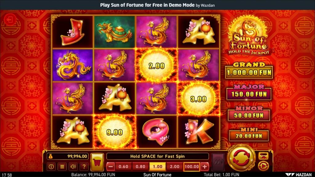 สล็อต Sun Of Fortune นี่คือสล็อตธีมตะวันออกที่มีสัญลักษณ์ต่างๆ เช่น มังกรคู่บารมี ปลาคาร์พหลากสีสัน เต่ามังกร ฟีนิกซ์ และดวงอาทิตย์แห่งโชคลาภความอบอุ่นจากแสงอาทิตย์จะทำให้โชคลาภของคุณอุ่นขึ้น และช่วยให้คุณค้นพบฟีเจอร์ Hold the Jackpot ยอดนิยมของ WAZDAN ในช่องนวัตกรรมใหม่ที่มี 16 วงล้ออิสระนี้หรือไม่? ไม่ว่ายอดรางวัลของคุณจะออกมาเป็นเช่นไร คุณสามารถมั่นใจได้ในการผจญภัยแบบตะวันออกที่เผ็ดร้อนด้วยสัญลักษณ์ตามธีมและฟีเจอร์โบนัสมากมาย