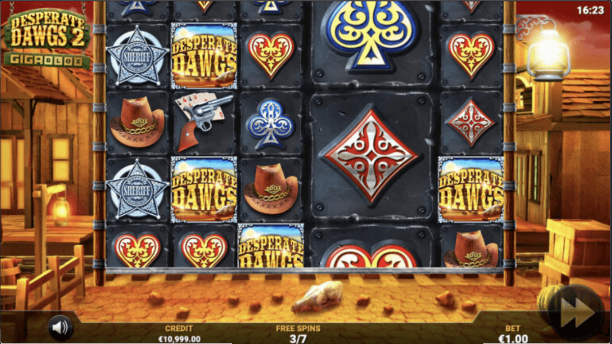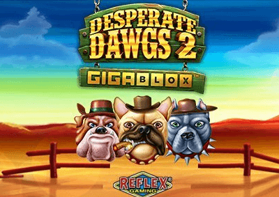 เรามีสุนัขตัวเอกสามตัวกลับมาอีกครั้งในเกม Desperate Dawgs 2 GigaBlox™ ที่มีธีมสุดฮานี้ พื้นหลังมีทิวทัศน์ทะเลทรายที่เต็มไปด้วยต้นกระบองเพชร นกแร้ง และภูเขา ในขณะที่บนวงล้อจะมีตัวละครหลักและชุดไพ่ที่ออกแบบมาให้ดูเหมือนตรานายอำเภอ