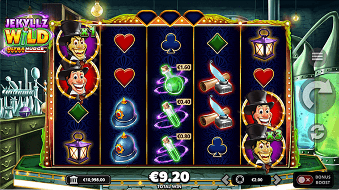 สัญลักษณ์พรีเมียมจะจ่ายระหว่าง 1 ถึง 5 เท่าของเงินเดิมพันของคุณเมื่อชนะ 5 ครั้ง และคุณยังมีสัญลักษณ์ Dr Jekyll และ Mr Hyde Wild ที่เข้ามาแทนที่สัญลักษณ์การจ่ายเงินเพื่อช่วยให้ชนะได้สำเร็จ การชนะใดๆ รวมถึงสัญลักษณ์ Wild ใดสัญลักษณ์หนึ่งจะเปิดใช้งานคุณสมบัติ Ultranudge จากนั้นสัญลักษณ์ทั้งหมดจะเลื่อนลง และสิ่งนี้จะเกิดขึ้นซ้ำตราบใดที่คุณยังคงชนะ สัญลักษณ์ยาจ่ายจะจ่ายเช่นเดียวกับสัญลักษณ์ชนะไลน์ปกติ แต่ยังมีเงินรางวัลระหว่าง 0.2 ถึง 50 เท่าของเงินเดิมพัน สัญลักษณ์ Dr Jekyll wild หนึ่งตัวหรือมากกว่านั้นสามารถเปลี่ยนเป็นสัญลักษณ์ Mr Hyde wild ได้ในทุกการหมุนที่กำหนดโดยมีสัญลักษณ์ยาอยู่ และสัญลักษณ์ Mr Hyde wild ที่แปลงร่างแล้วแต่ละอันจะรวบรวมเงินรางวัลยาทั้งหมดที่เห็น ซึ่งจะเปิดใช้งานคุณสมบัติ Ultranudge และสัญลักษณ์ Mr Hyde wild จะได้รับMultipliersเพิ่มขึ้น +1 ต่อครั้ง หนึ่งครั้ง สัญลักษณ์ Dr Jekyll wild ที่มีอยู่และ/หรือใหม่สามารถแปลงเป็นสัญลักษณ์ Mr Hyde wild ได้ และสัญลักษณ์ Mr Hyde wild ทั้งหมดจะรวบรวมเงินรางวัลยาทั้งหมดที่มีอยู่ต่อครั้ง MultipliersWildsใช้ได้กับทั้งรางวัลเงินสดจากยาและการชนะไลน์ คุณต้องได้รับหรือสะสมScattersโบนัส 3 อันเพื่อเรียกใช้รอบโบนัส และScattersอาจปรากฏขึ้นระหว่างฟีเจอร์ Ultranudge คุณจะได้รับฟรีสปิน 12 ครั้ง และMultipliersWilds Mr Hyde จะเพิ่มขึ้น +1 ต่อ Ultranudge โดยไม่ต้องรีเซ็ตเลย ScattersWilds Mr Hyde ใหม่ใดๆ จะเริ่มต้นที่ระดับMultipliersปัจจุบันเสมอ และการชนะทั้งหมดจะเรียกใช้ฟีเจอร์ Ultranudge คุณสามารถเรียกใช้รอบโบนัสอีกครั้งเพื่อรับสปินพิเศษ +12 ครั้ง และคุณยังสามารถเสี่ยงเพื่อรับสปินเพิ่มเติมล่วงหน้าได้อีกด้วย ฟีเจอร์ Mr Hyde Gamble เป็นวงล้อโบนัสที่จะให้คุณได้รับMultipliersWildsเริ่มต้น Mr Hyde จำนวน x10 แต่โปรดระวัง เพราะการแพ้เดิมพันจะหมายถึงเสียฟีเจอร์ทั้งหมดไปในที่สุด