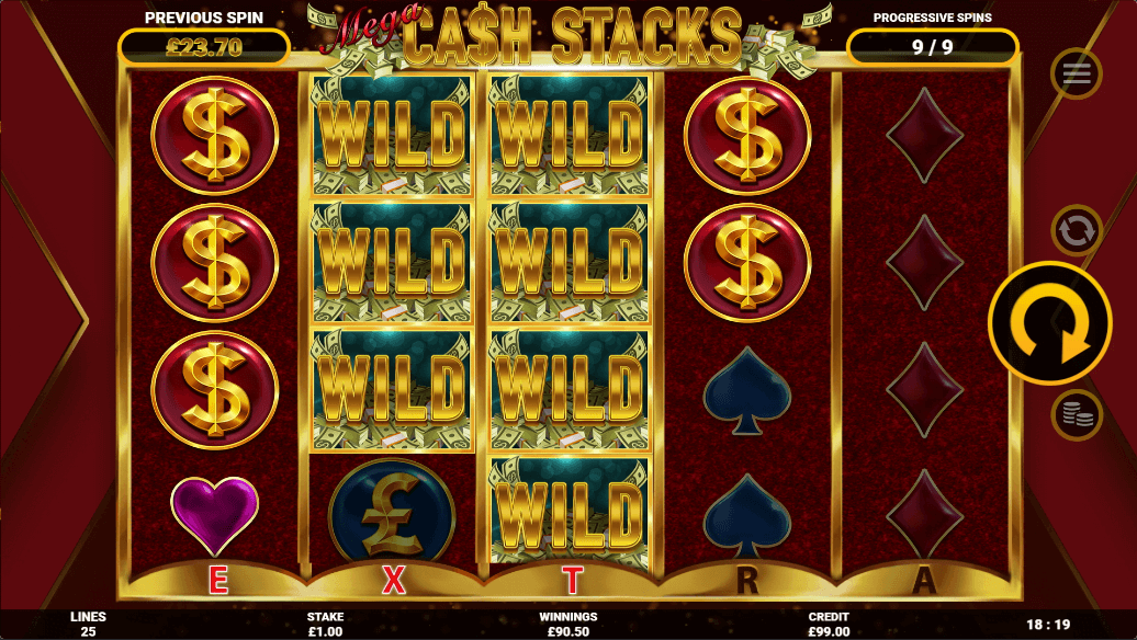 มีสัญลักษณ์ปกติ 9 อันบนวงล้อในสล็อตแมชชีนนี้: สัญลักษณ์ที่มีการจ่ายเงินสูง 5 อันและสัญลักษณ์ที่มีการจ่ายเงินต่ำ 4 อัน สัญลักษณ์ที่มีการจ่ายเงินสูงได้แก่ สัญลักษณ์ Mega Cash Stack, Yen, GBP, USD และ Euro ในขณะที่สัญลักษณ์ที่มีการจ่ายเงินต่ำประกอบด้วยชุดไพ่โพดำ ดอกจิก หัวใจ และข้าวหลามตัด นอกจากนี้ยังมีสัญลักษณ์เงินสดแบบWildsที่จะแทนที่สัญลักษณ์อื่นใดยกเว้นสัญลักษณ์เงินสดโบนัส เมื่อพูดถึงสัญลักษณ์เงินสดโบนัส สัญลักษณ์นี้สามารถให้เข้าสู่รอบหมุนฟรีได้ นอกเหนือจากสัญลักษณ์ที่เรียงซ้อนกันอย่างหนาแน่นซึ่งประดับอยู่บนวงล้อตั้งแต่เริ่มต้น โดยเรียงวงล้อด้วยสัญลักษณ์เดียวกันเพื่อเพิ่มโอกาสในการชนะรางวัล ยังมีเกมหมุนฟรีอีกด้วย หากต้องการเข้าเล่นเกมเหล่านี้ ผู้เล่นจะต้องหมุนวงล้อให้ได้สัญลักษณ์เงินโบนัส 3 อันในตำแหน่งใด ๆ บนวงล้อ หรือต้องโชคดีกับคุณสมบัติการพนัน เกมฟรีเริ่มต้นด้วยผู้เล่นต้องหมุนวงล้อเพื่อดูว่าจะได้รับฟรีสปินกี่ครั้ง ในระหว่างการหมุนฟรี การหมุนแต่ละครั้งจะเสนอการหมุนแบบโปรเกรสซีฟที่มีมูลค่ารางวัลที่สูงกว่า นอกจากนี้ ผู้เล่นยังสามารถเรียกใช้ฟรีสปินอีก 5 ครั้งได้โดยเปิดคำว่า “พิเศษ” ขึ้นใต้วงล้อ